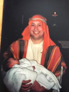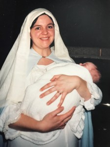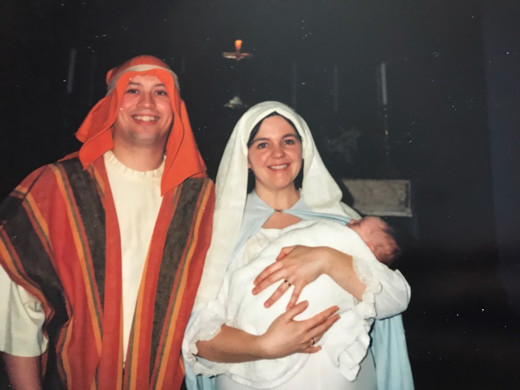 A couple of weeks later we received a package in the mail. The pageant committee had taken some photos that they had included and there was also a really lovely letter telling us how impressed people were with our performance, how so many parishioners were moved to tears, how radiant we all were, the perfect embodiment of the holy family. Never mind that we were so, so sleep-deprived, that I was still healing from the emergency c-section I’d had; that John hadn’t shaved in days, that I couldn’t remember the last time I’d showered. But maybe that was the point. Maybe what they saw was a couple of 20-somethings with their first child, without a real clue what to expect, fumbling along, doing their best in front of everyone. Maybe we reminded some of them of their own early days as parents, or maybe they even thought of that family in the stable and how staggeringly tired and confused they would have been, too.