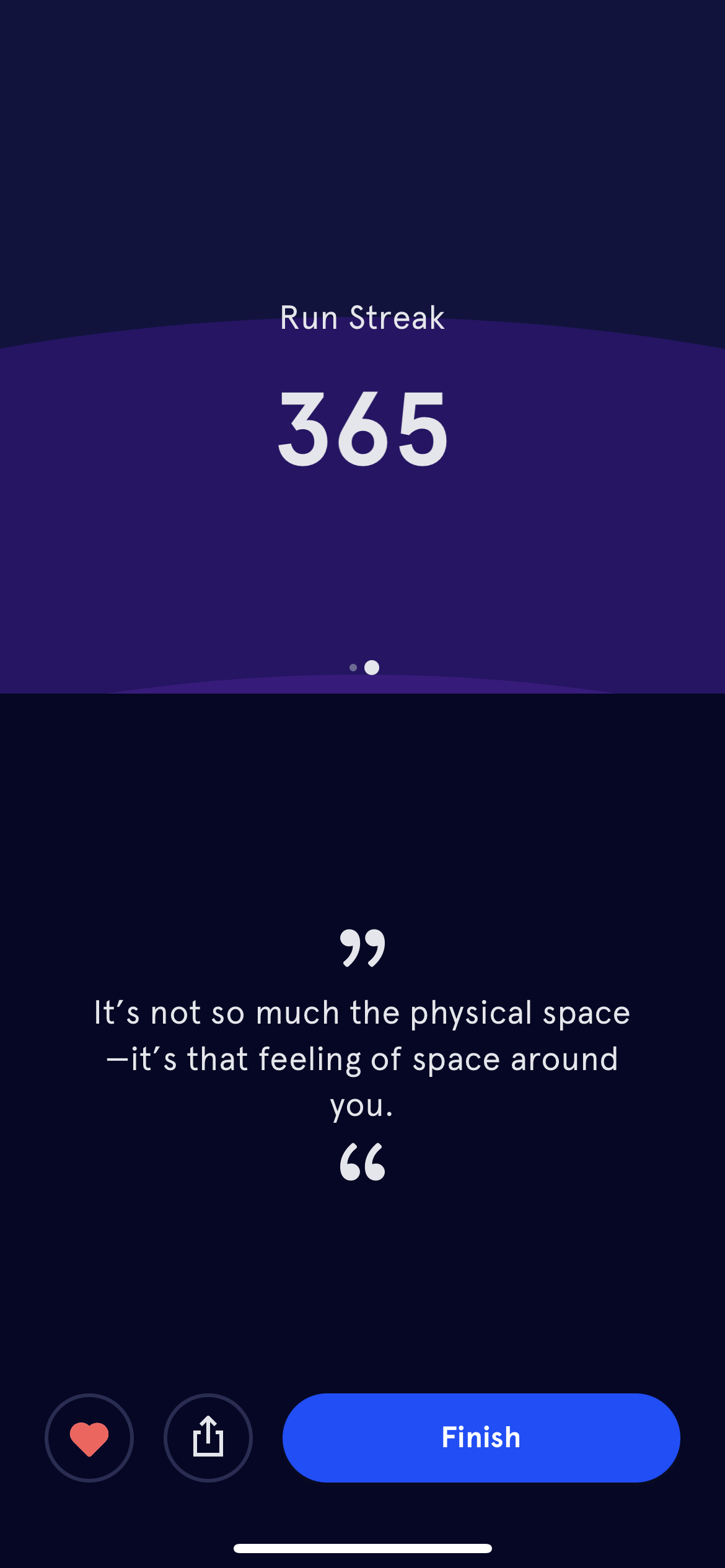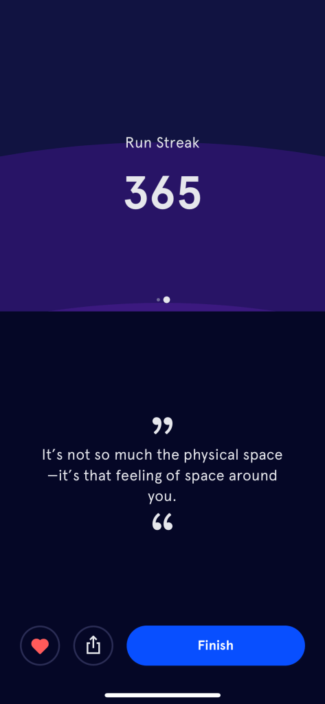 And yesterday when I finished my morning meditation, I did see the little number tick over and the screen read “Run streak: 365 days.